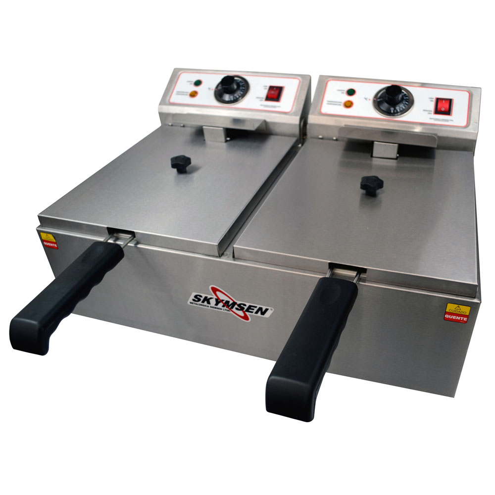 Tanque confeccionado em aço inoxidável para fácil limpeza e com capacidade para 10 litros (2 x 5 litros) de óleo.