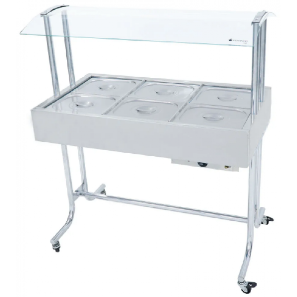 Buffet térmico utilizado para servir alimentos com temperatura regulável de 20ºC a 80°C. Utilizado em restaurantes e refeitórios. O equipamento possui estrutura tubular cromada, sistema de platibanda que serve também como tampa para as cubas gastronômicas. Cobertura em vidro curvo, temperatura de aquecimento controlada por termostato, pés cromados com tubo inteiro e possui rodízios com trava.