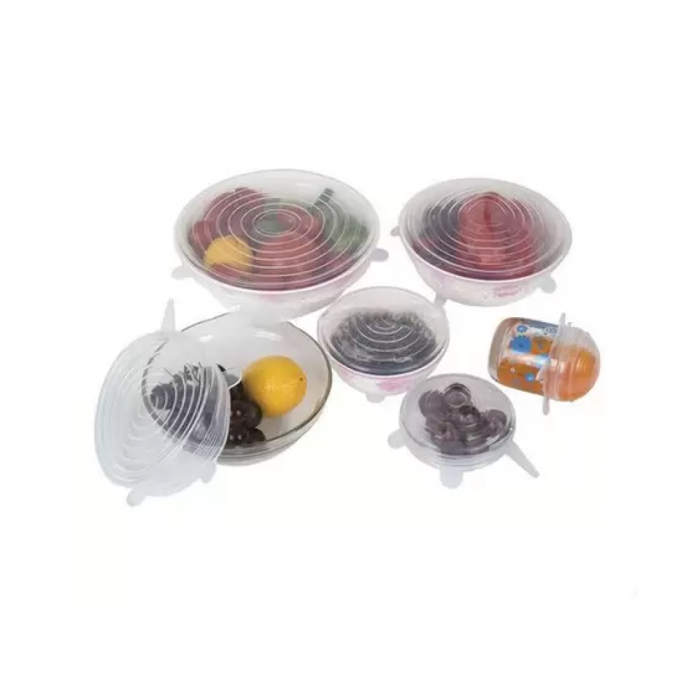 Conjunto com 6 tampas herméticas expansíveis de silicone de variados tamanhos.