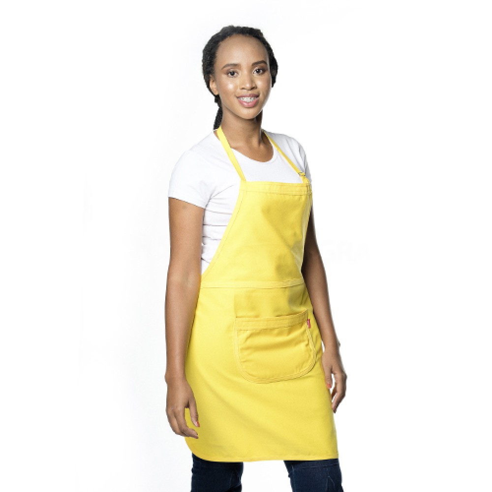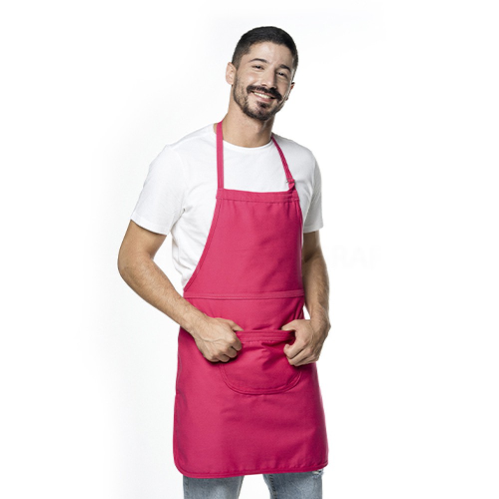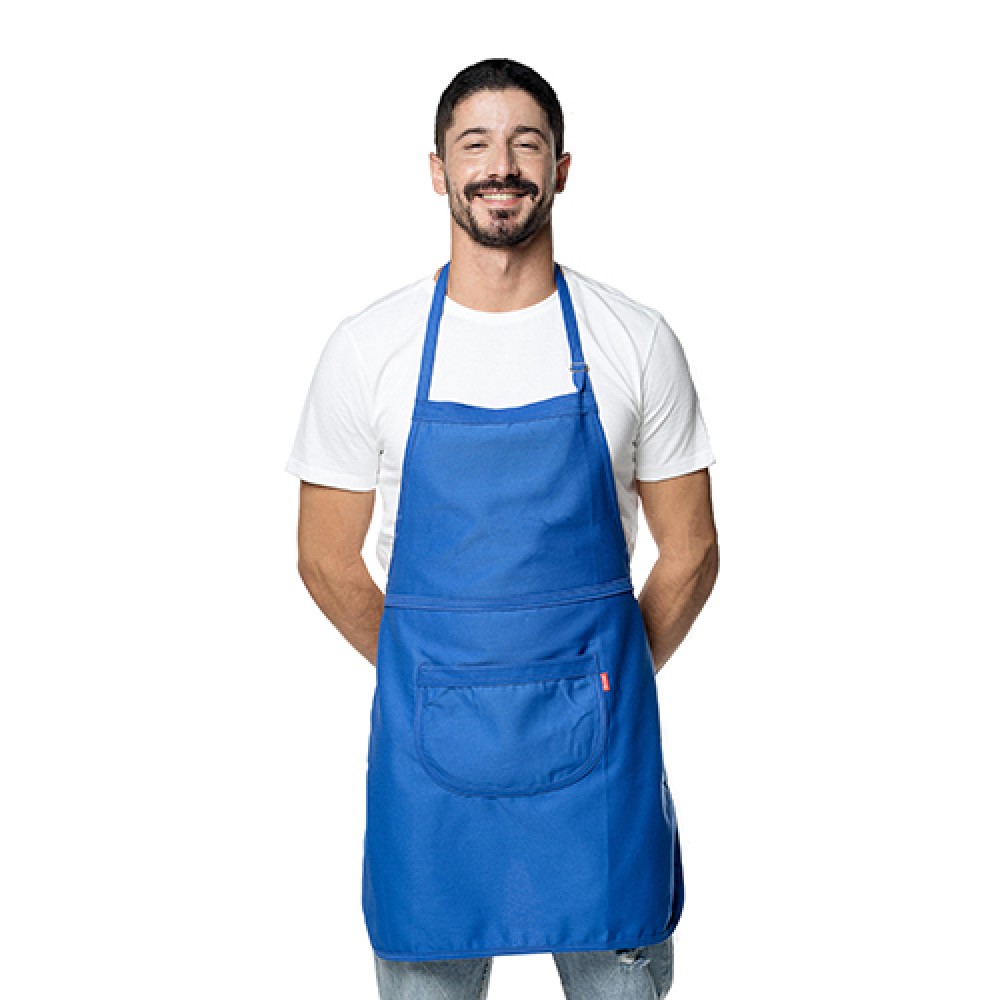 Avental em tecido 100% poliéster, alça fixa no pescoço e alças laterais para ajuste, bolso lado..