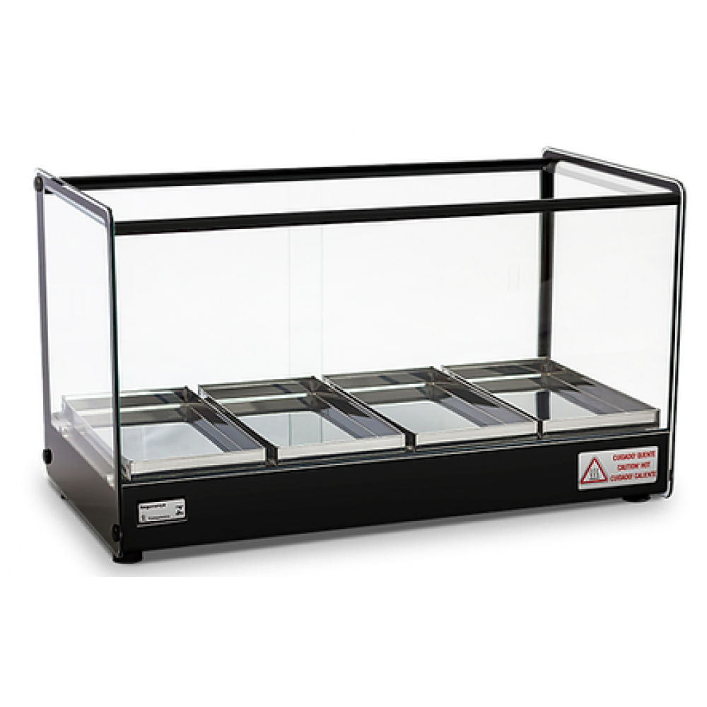 Estufa para salgados seu design clean e compacto confere  melhor visualização dos alimentos, além de preservar seus produtos quentes e saborosos. Estrutura fabricada em perfil de alumínio anodizado e aço inox; bandejas com dobras de aço inox; todos os vidros temperados; termostato, resistência elétrica em aço inox 304 tubular; fiação elétrica com revestimento em silicone resistente a 300°C.
