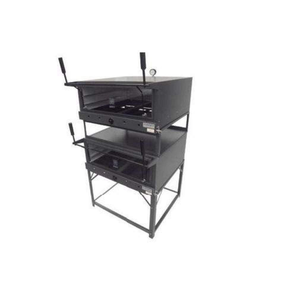 Aquecimento através de pedra refratária e queimador com gaveta. Possui duas câmaras.