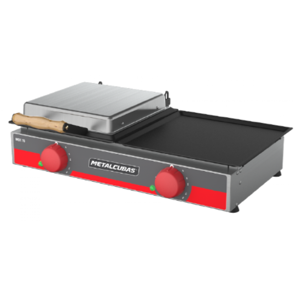 Sanduicheira Grill elétrica, possui a chapa superior e inferior em aço carbono de 2,0 mm estampado, possui três resistências em aço inox, termostatos para controle de temperatura em até +320°C, pés de borracha antiderrapante com regulagem, estrutura externa em aço inox 430 escovado, e cabo em madeira impermeabilizada, possui led indicador de aquecimento, tampa superior articulada que se ajusta a altura do alimento. Produto em conformidade com a INMETRO.