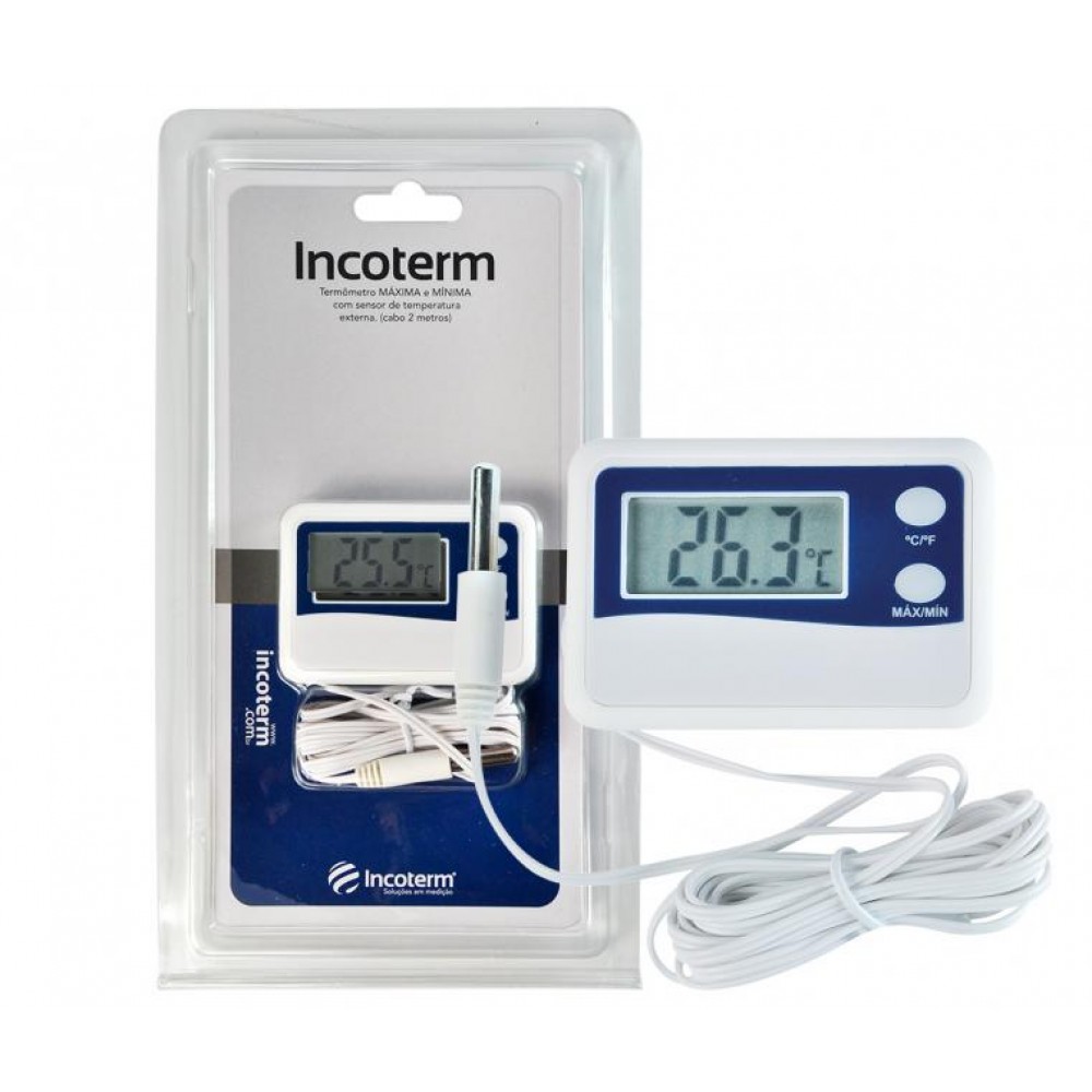 O termômetro digital de máxima e minima é um instrumento de qualidade comprovada Incoterm, com visor decimal, de fácil leitura, à prova d'água e função °C//F, é indicado para várias aplicações como: monitoramento da temperatura de freezers, caixa de vacinas, salas de armazenamento e ambientes climatizados em geral.